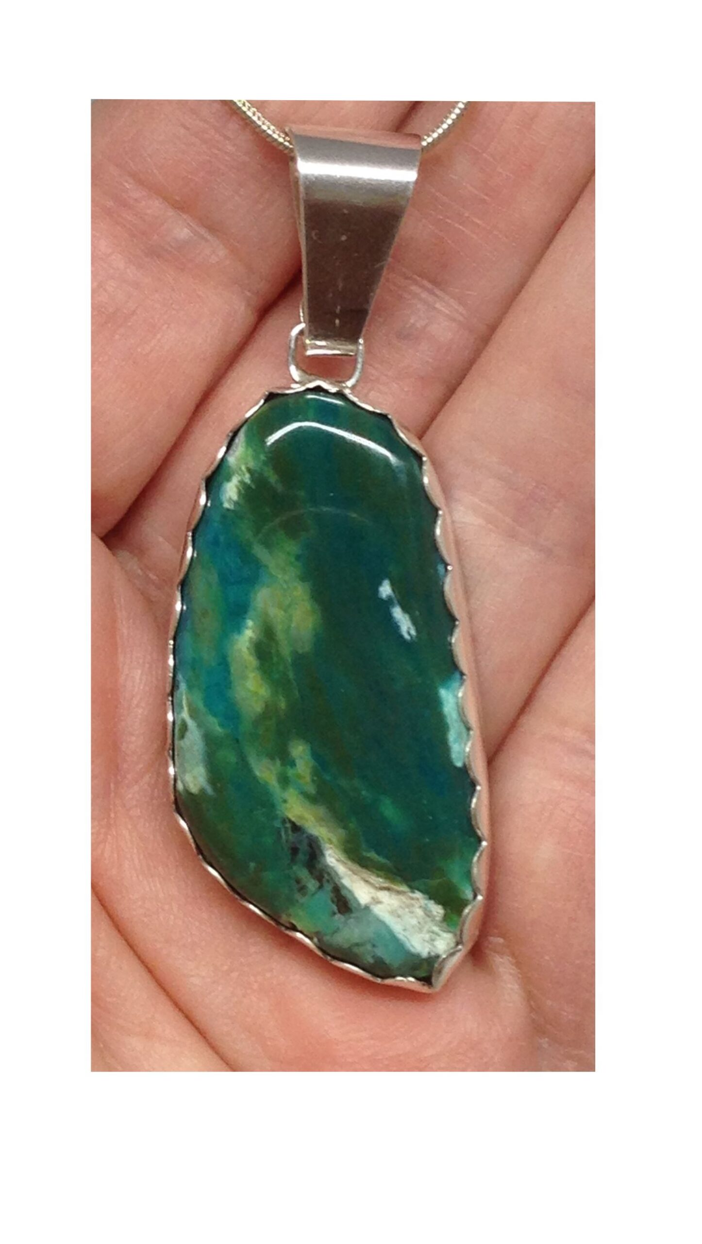 Beautiful Dark Green Chrysoprase Pendant. This unique green stone has Fine Silver on the Sides and back. It is about 1-3/4″ x 1″. It was cut, polished and completed by hand in Reno Nevada USA.