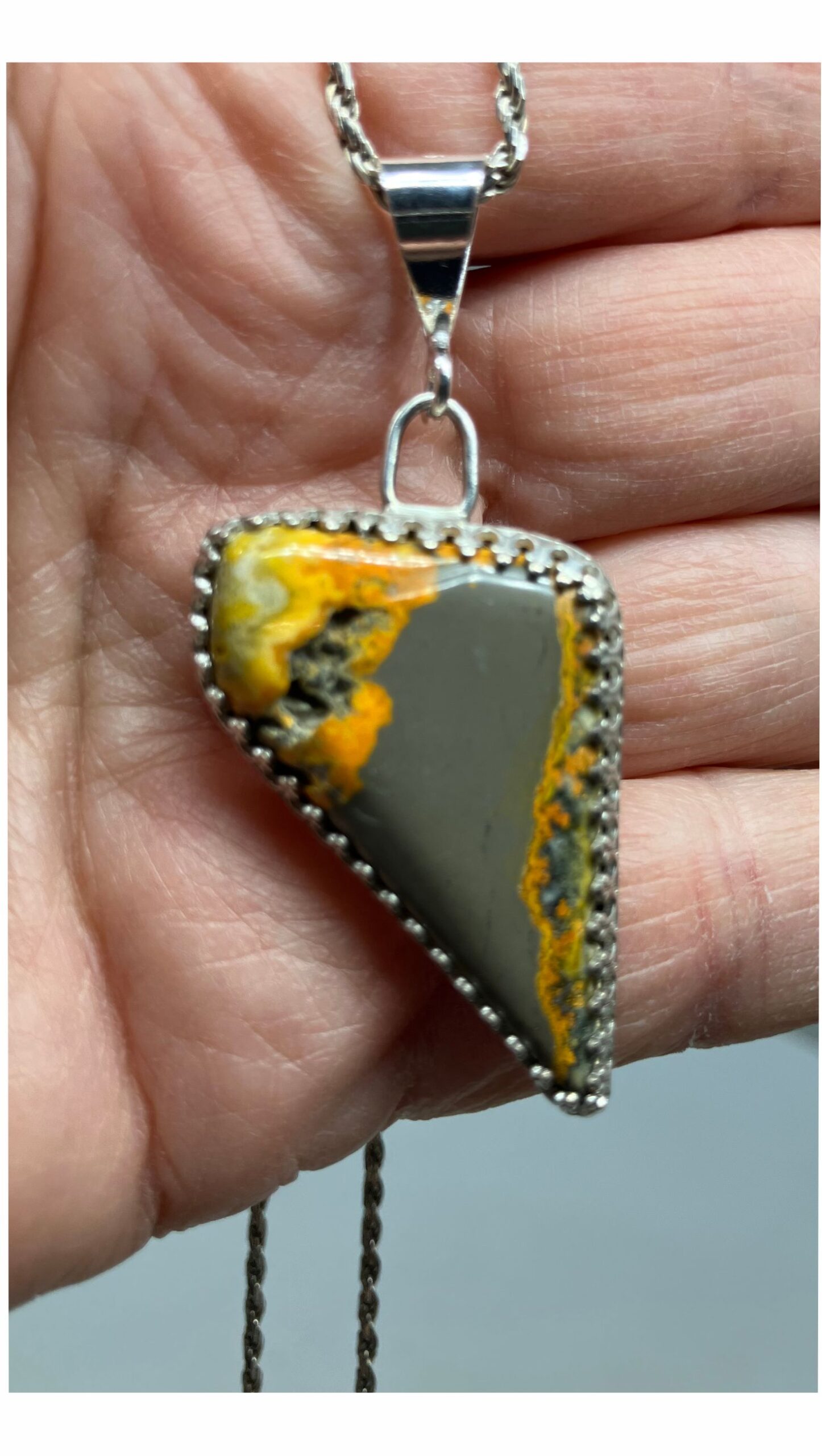 Yellow Bumble Bee Pendant. Sterling Silver Bezel and Bail. Fine Silver back. Approximately 1-1/4″ x 1″. Stone from Australia. Cut, polished and completed by hand in Reno, Nevada USA. The shape resembles the State of Nevada.