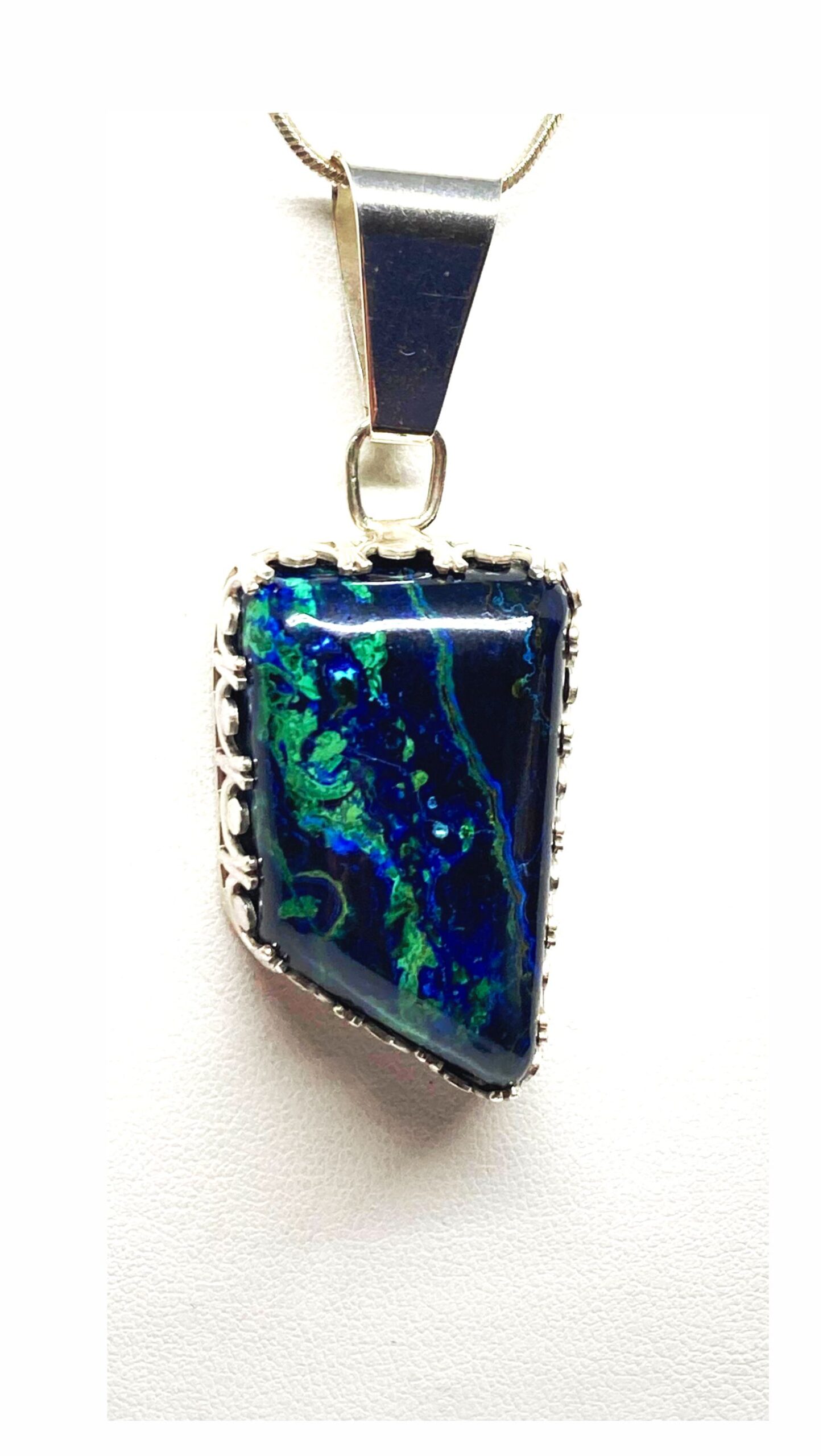 Tags: Blue and Green Chrysocolla Pendant, Blue Azurite, Blue Pendant, Chrysocolla Pendant, Green Malachite, Handcrafted in Reno NV USA, Made in USA, Nevada, One of a Kind, Real Stone, Sterling Silver