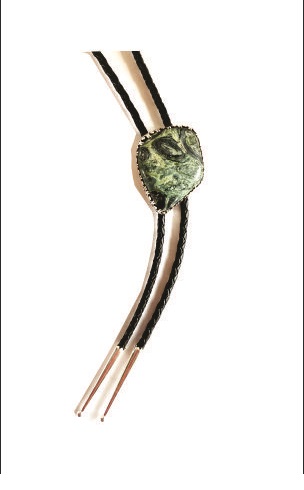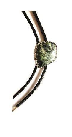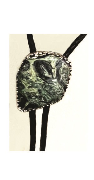 This a wonderful Green Crocodile Jasper Bolo with 42″ Black Leather Cord. The tips and bezel are Sterling Silver. The stone is approximately 1-3/4″ x 1-1/4″. The stone from Madagascar was cut, polished and completed by hand in Reno Nevada USA. This is a unique and rare stone.