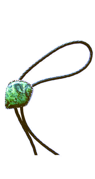 Green Crocodile Jasper Bolo with a 42″ Black Leather Cord. The tips and bezel are Sterling Silver. The stone is approximately 1-3/4″ x 1-1/4″. Madagascar stone. Cut, polished and completed by hand in Reno Nevada USA. This is a unique and rare stone.