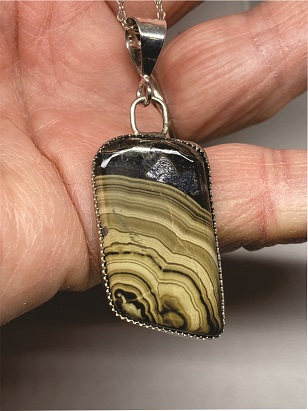 This is an unusual tan and black Flint Stone Pendant. This wonderful gemstone came from Poland and is considered a Semi-precious stone and was cut, polished and completed by hand in Reno, Nevada USA. The wavy dark and light brown stripes give it real personality and are completed with dark gray at the top. This wonderful tan and gray pendant is approximately 1-1/4″ x 3/4″ and has Fine Silver on the sides and back.