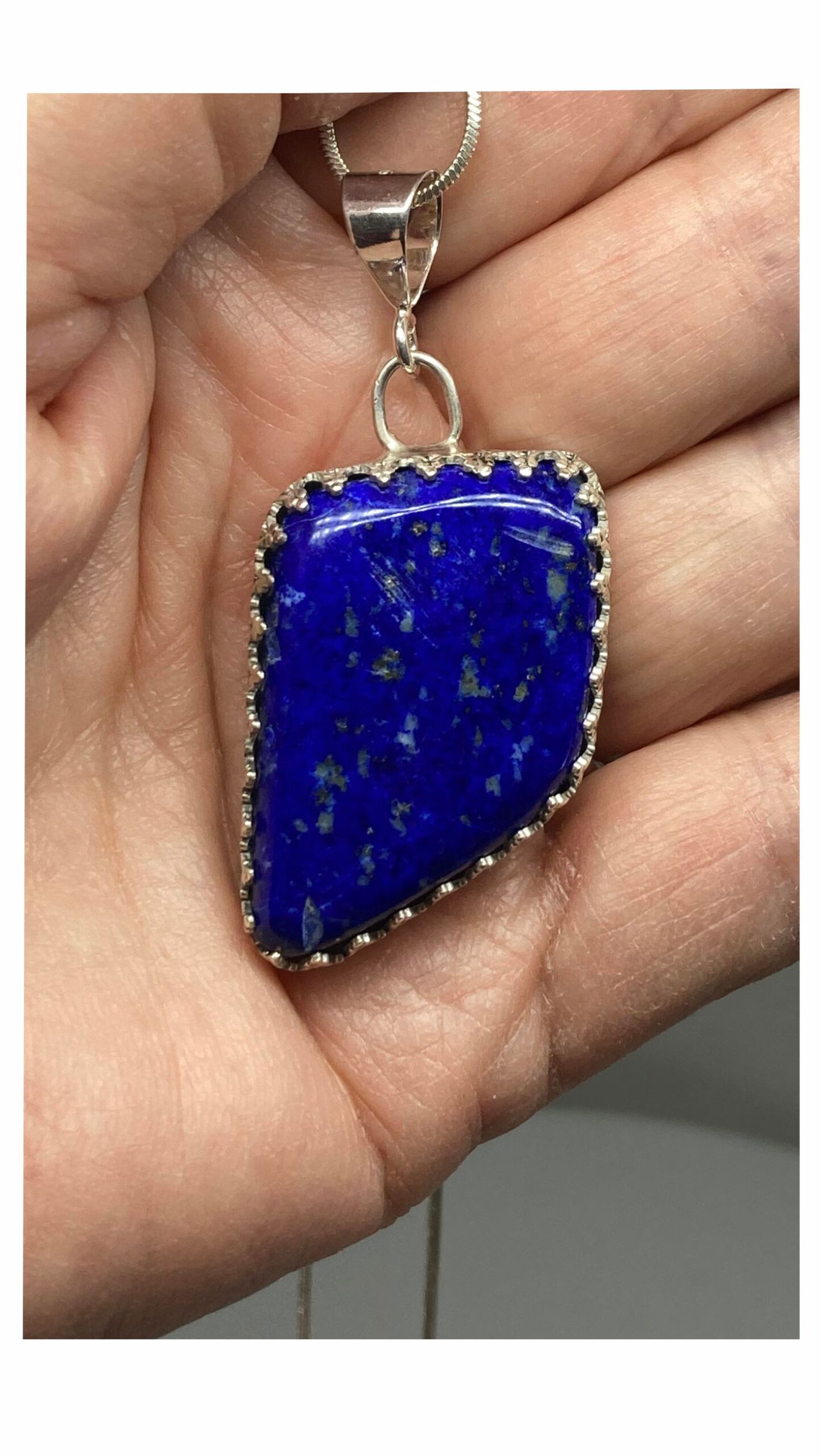 This beautiful Lapis Lazuli pendant is a rich blue color with darker colors throughout the stone. It resembles the State of Nevada. It was cut, polished and completed by hand in Reno, Nevada USA. The side bezel is Sterling Silver and the back is Fine Silver. It is approximately 1-1/4″ x 1″. Lapis is a very popular blue stone.