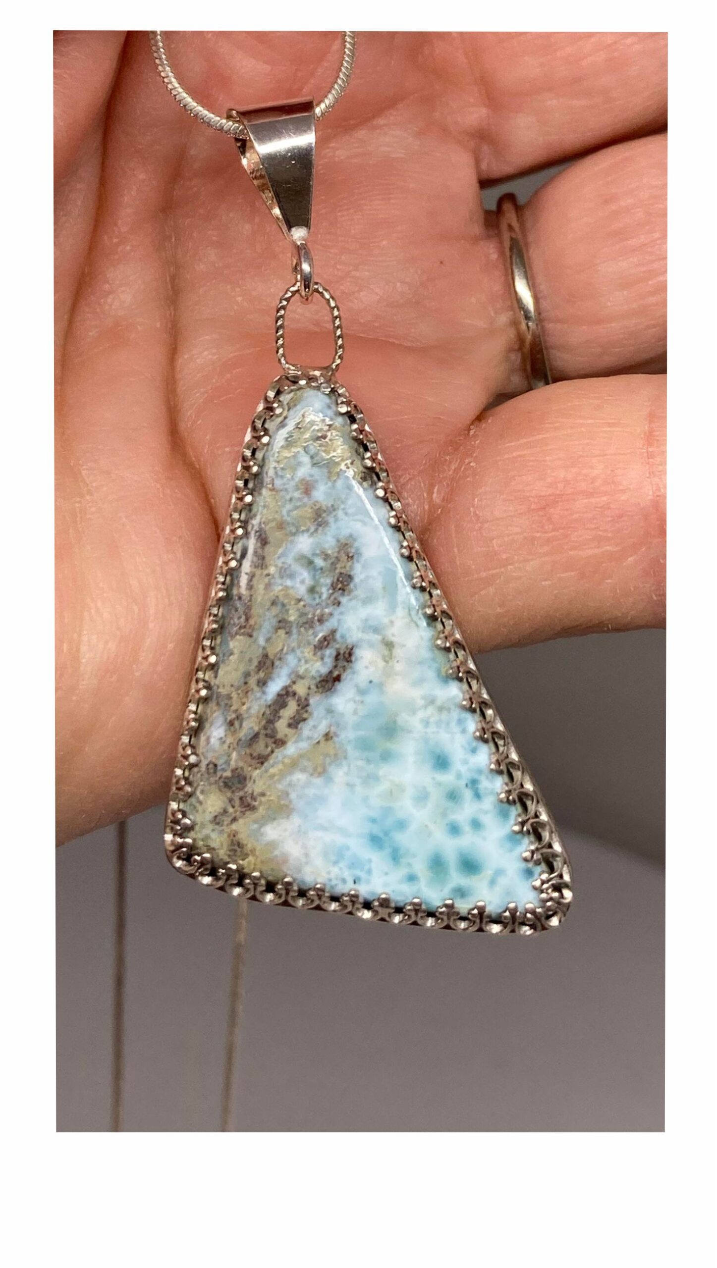 Tags: Blue and White Larimar Pendant, Blue Pendant, Handcrafted in Reno NV USA, Larimar Pendant, Made in USA, One of a Kind, Real Larimar, Sterling Silver, Unique Larimar