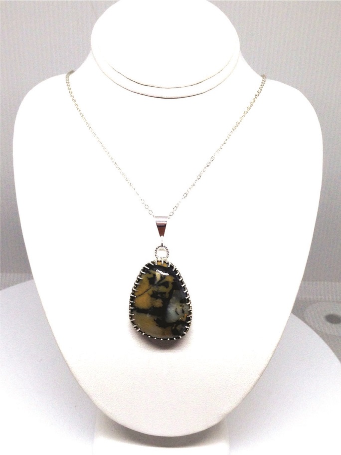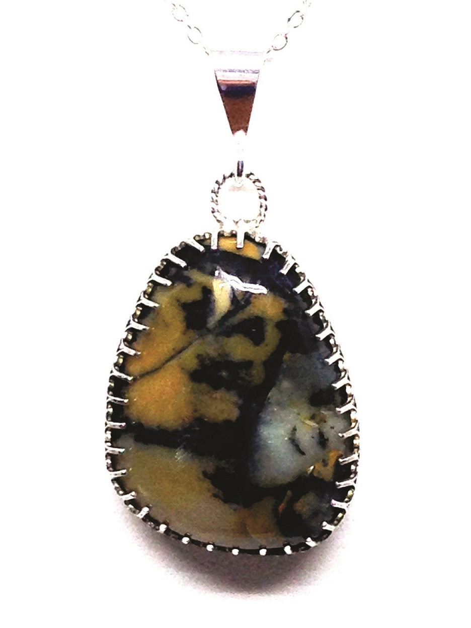 This beautiful Tan Opal was mined in Nevada and is unique in the colors. It is called Florescent Opal because when an IR light is shown on it, the white areas turn to green. This beautiful Opal has Sterling Silver on the sides that were custom made for this gemstone. The back is Fine Silver and the bail is Sterling Silver. The size of this beautiful opal pendant is 1-1/2″ x 1″. Opal is birthstone for October birthday.