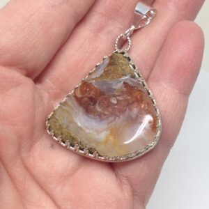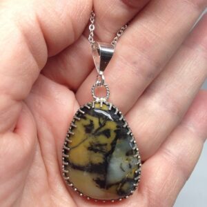 Clear White Opal with blue fire came from Ethiopia and appears to have an opal within an opal. The pendant is approximately about 1″ x 3/4″, The gemstone has a Sterling Silver bezel on the sides and Fine silver on the back. The opal was cut, polished and completed by hand in Reno, Nevada USA. Opal is the birthstone for October.