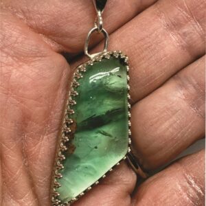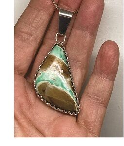 Clear White Opal with blue fire came from Ethiopia and appears to have an opal within an opal.  The pendant is approximately about 1″ x 3/4″,  The gemstone has a Sterling Silver bezel on the sides and Fine silver on the back.  The opal was cut, polished and completed by hand in Reno, Nevada USA.  Opal is the birthstone for October.
