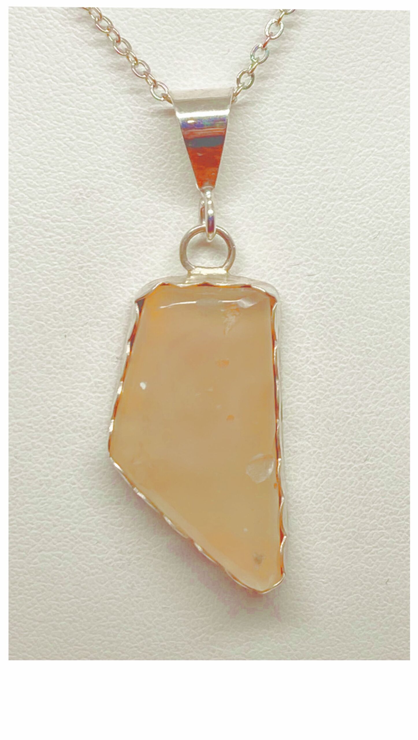 This transparent soft yellow Pendant is Calcite Stone that resembles the State of Nevada. The side bezel and back are Fine Silver. The bail is Sterling Silver. The pendant is approximately 1-1/2″ x 3/4″. It was cut, polished and completed by hand in Reno, Nevada USA.