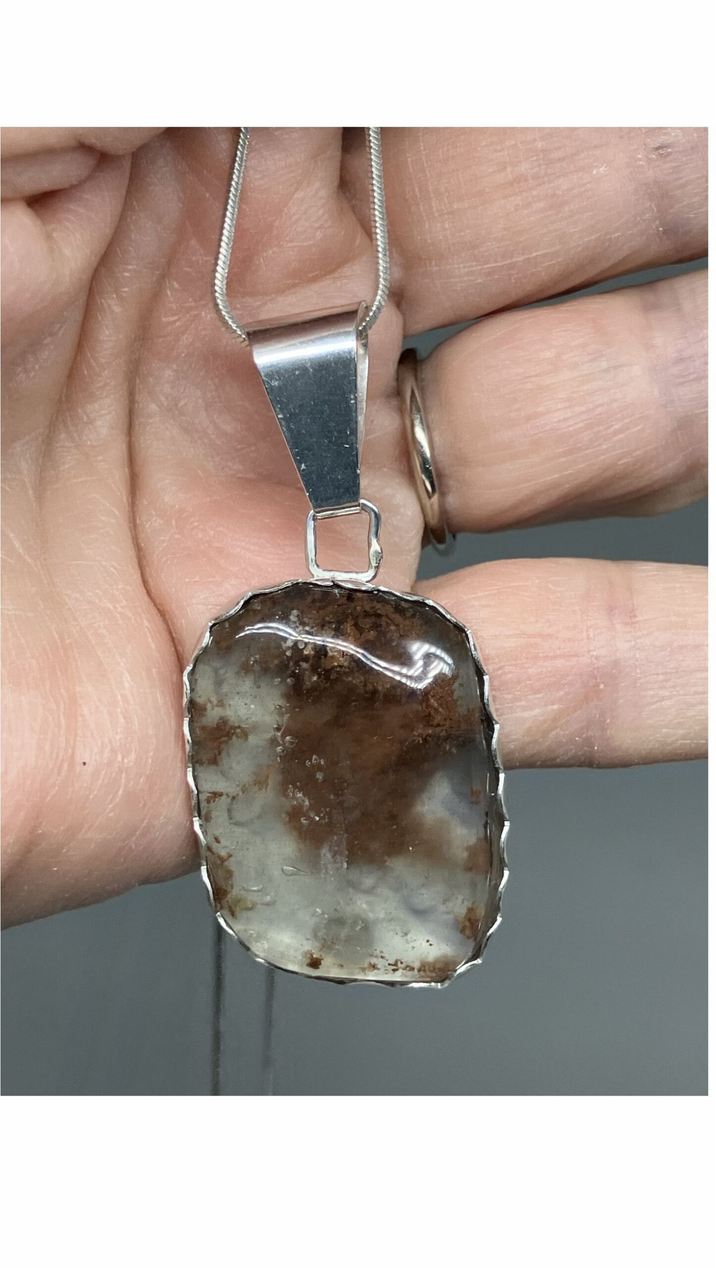 Unique clear opal pendant with brown and Fine Silver showing through. It is approximately 1-1/” x 1″. Cut, polished and completed by hand in Reno, Nevada USA. Opal is birthstone for October.