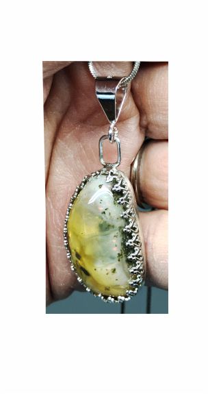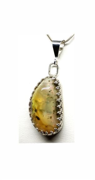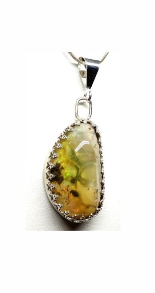 Clear yellow opal pendant has many colors throughout the natural stone.  Cut, polished and completed by hand in Reno, Nevada USA.  Sterling Silver bezel and bail.  The back is Fine Silver.  Approximately 1-1/4″ x 3/4″.  October birthstone.