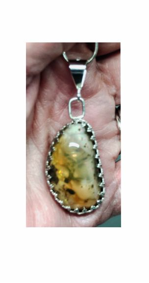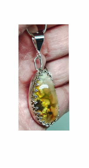 This wonderful clear yellow opal pendant has much personality with all kinds of colors throughout the natural stone.  It was cut, polished and completed by hand in Reno, Nevada USA.  The side bezel and bail are Sterling Silver.  The back is Fine Silver.  The stone is approximately 1-1/4″ x 3/4″.  Opal is the birthstone for October.