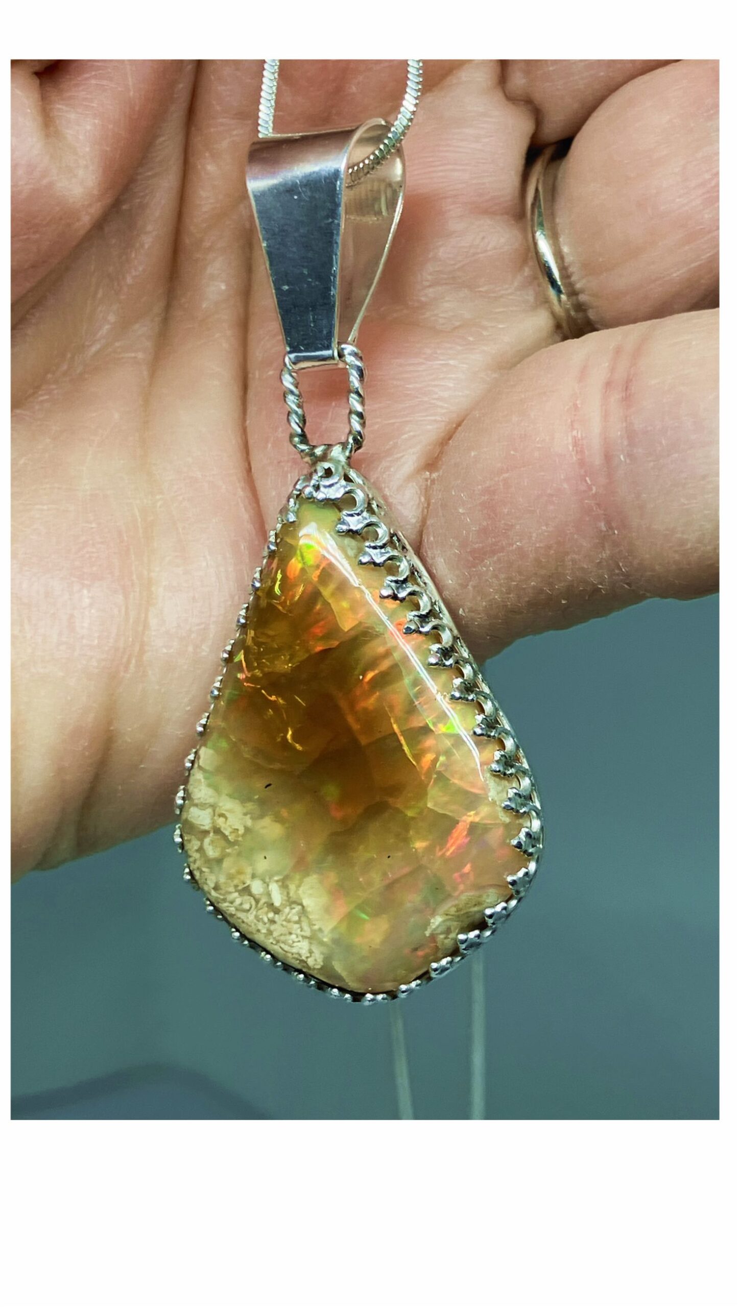 Opal pendant with deep clear orange color. We mined the stone in Nevada. It is one of a kind unique pendant. It was cut and polished it by hand in Reno, Nevada USA. Sterling Silver bezel with Fine Silver back. Approximately 1-1/2″ x 1″. Opal is October birthstone.