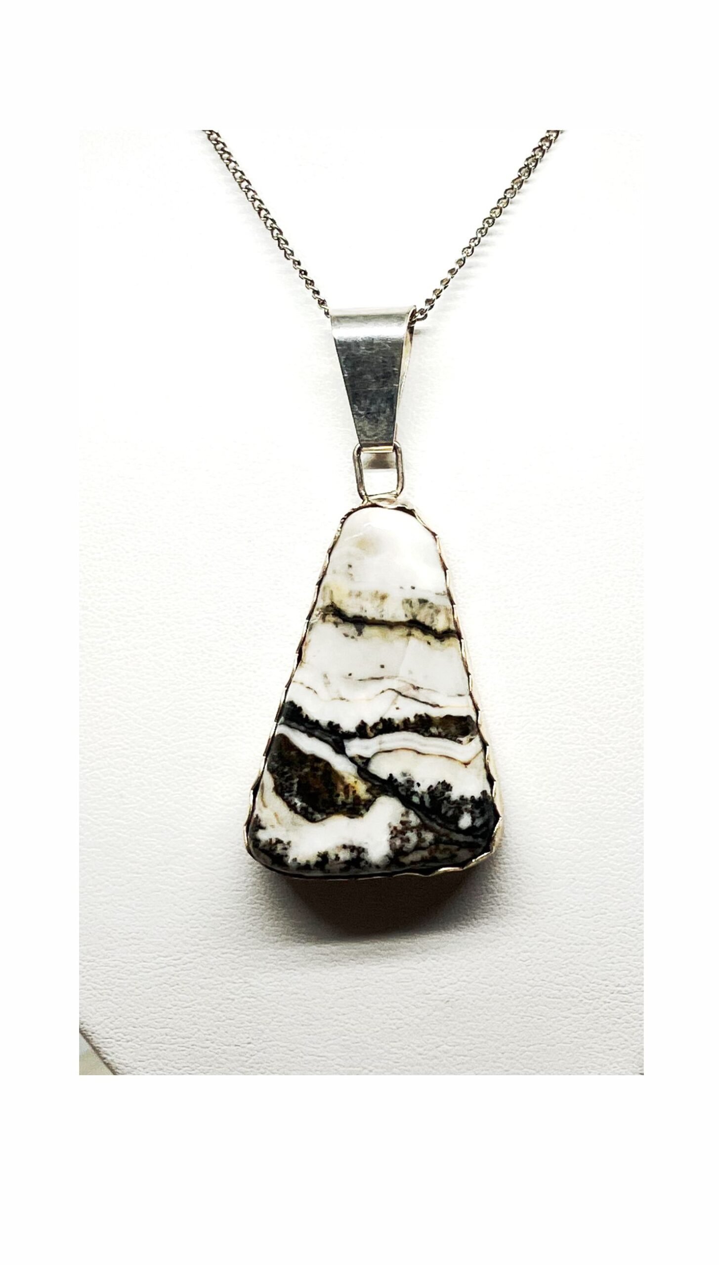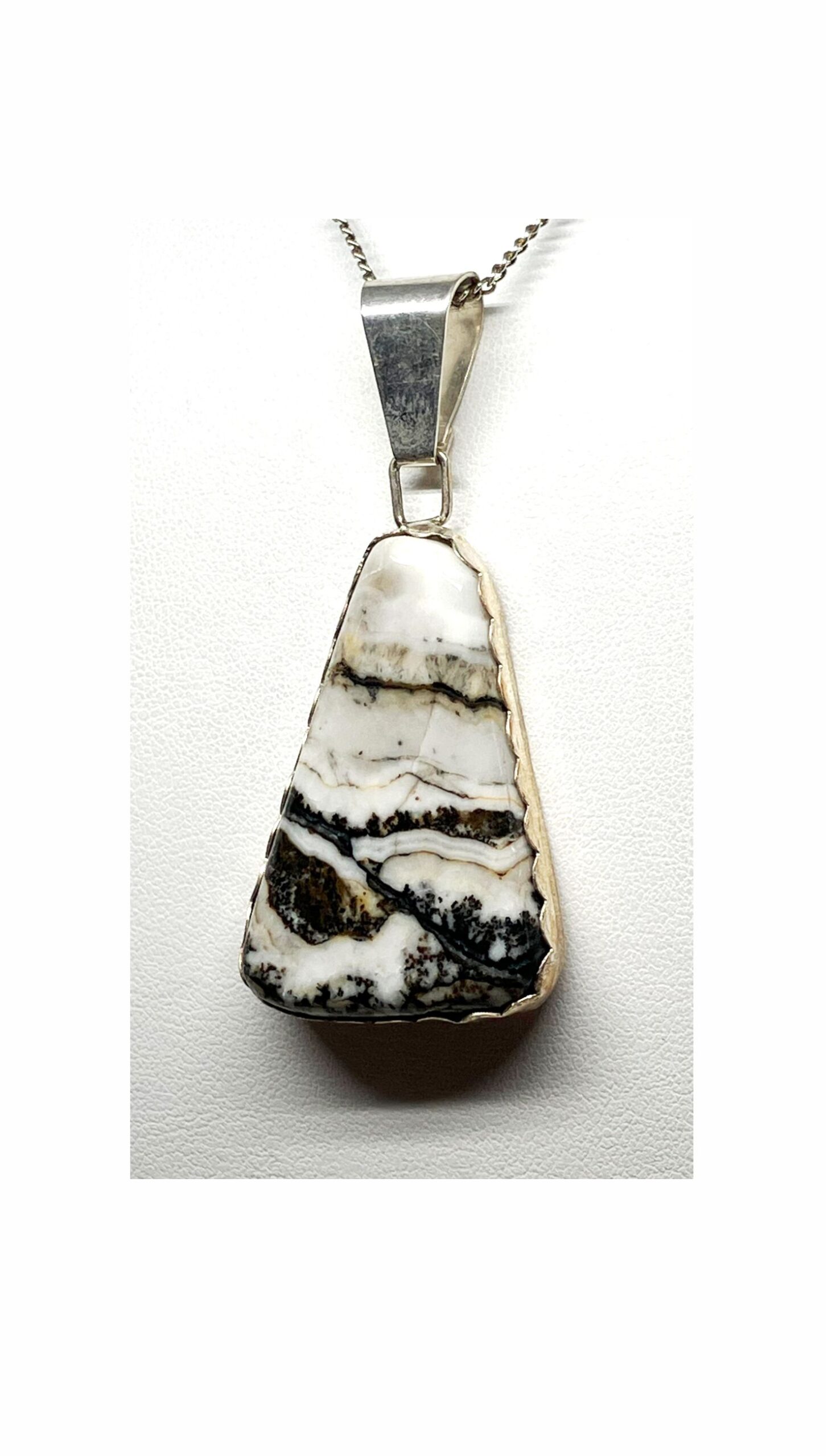 Triangle shaped white and black pendant resembles a scene. Unique real stone. Cut, polished and completed in Reno, Nevada USA. Fine Silver bezel and back. Approximately 1-1/2″ x 1″.