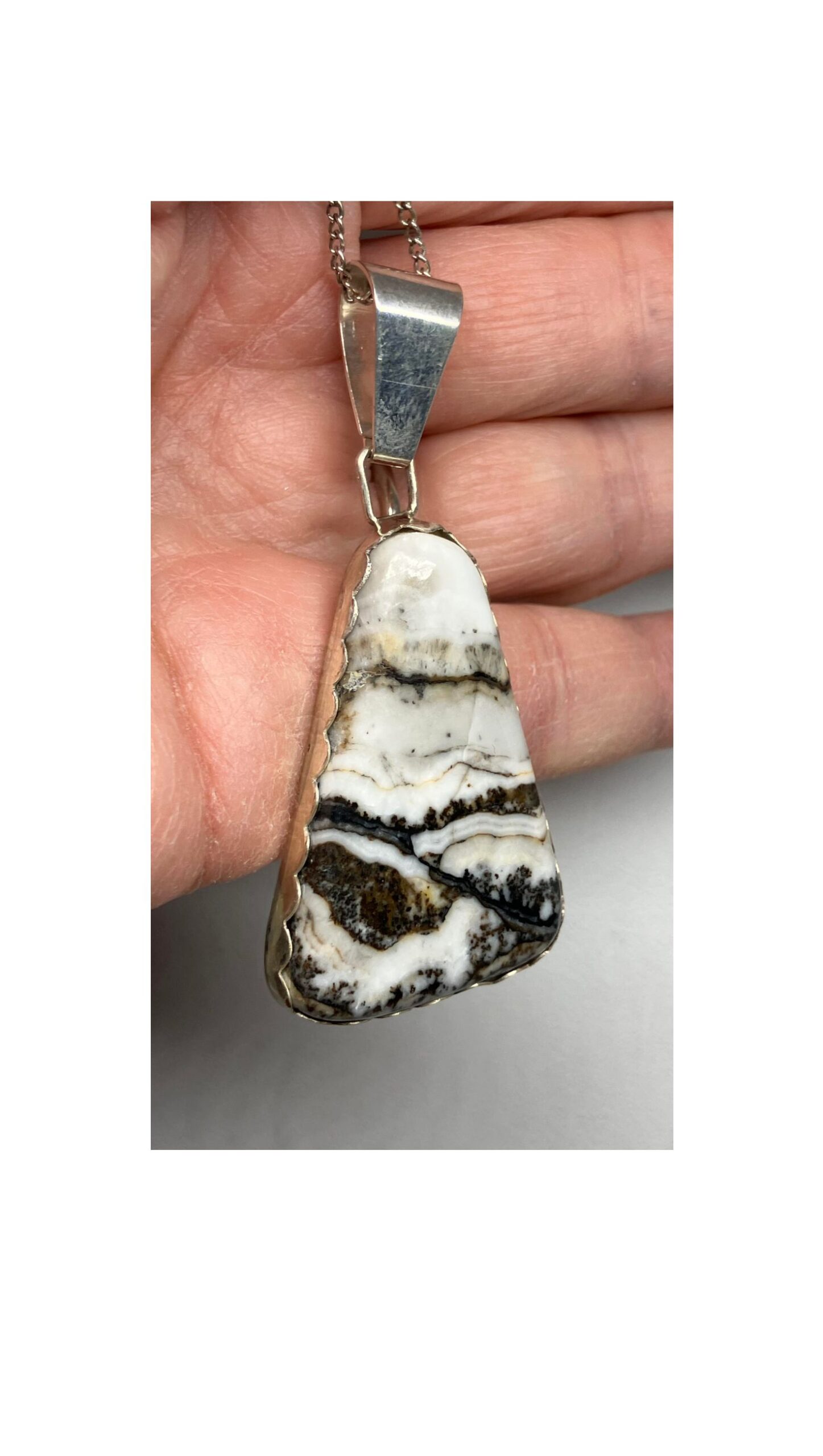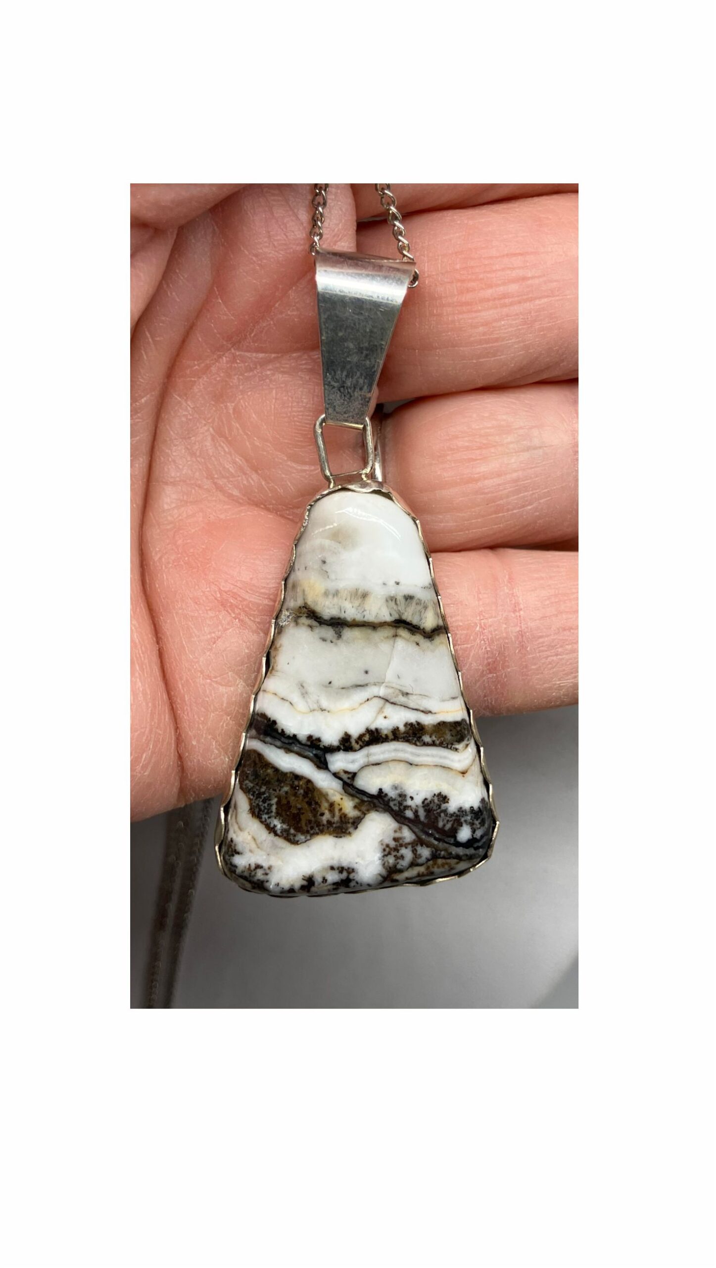 This triangle shaped white and black pendant resembles a scene and even has an animal appearing. The unique real stone was cut, polished and completed in Reno, Nevada USA. The side bezel and back are Fine Silver and the bail is Sterling Silver. It is approximately 1-1/2″ x 1″.