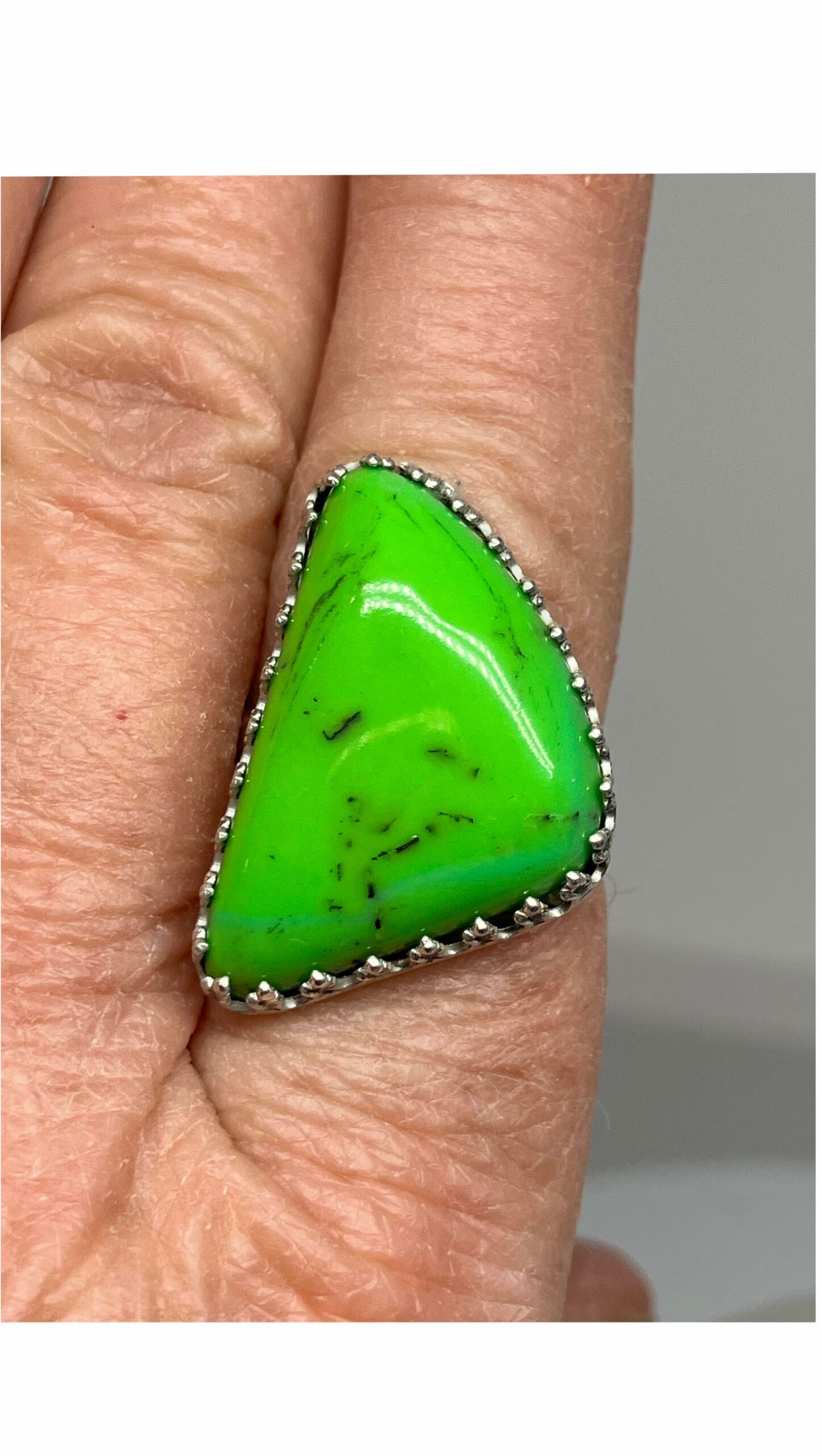 Tags: Gaspeite Ring, Gaspeite Stone, Green Ring, Handcrafted in Reno NV USA, Lime Green Ring, Rare Stone, Sterling Silver, Unique Ring
