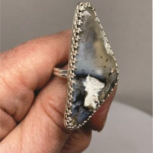 This is a wonderful Teardrop Shaped green Malachite Ring with a Fine Silver bezel. The lighter green swirls head toward the pointed tip. It is approximately 1″ x 3/4″. The Sterling Silver Ring band is about size 7-1/2. It was cut, polished and completed by hand in Reno, Nevada USA.
