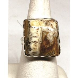 This is a wonderful Teardrop Shaped green Malachite Ring with a Fine Silver bezel. The lighter green swirls head toward the pointed tip. It is approximately 1″ x 3/4″. The Sterling Silver Ring band is about size 7-1/2. It was cut, polished and completed by hand in Reno, Nevada USA.