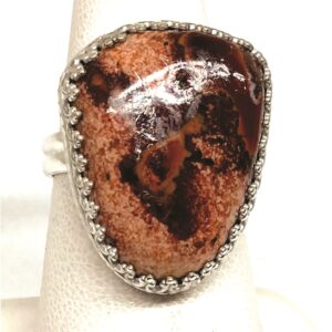 This is a wonderful Teardrop Shaped green Malachite Ring with a Fine Silver bezel. The lighter green swirls head toward the pointed tip. It is approximately 1″ x 3/4″. The Sterling Silver Ring band is about size 7-1/2. It was cut, polished and completed by hand in Reno, Nevada USA.