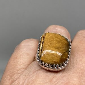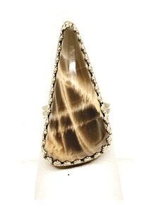 Beautiful ring with blue opal mixed in with the brown. From Australia Boulder Mine. Cut, polished and completed in Reno, Nevada USA. Approximately 1″ x 1/2″. About size 8-1/2 ring. Fine Silver bezel and back. Sterling Silver ring band. Opal is October birthstone.