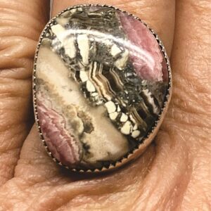Beautiful ring with blue opal mixed in with the brown. From Australia Boulder Mine. Cut, polished and completed in Reno, Nevada USA. Approximately 1″ x 1/2″. About size 8-1/2 ring. Fine Silver bezel and back. Sterling Silver ring band. Opal is October birthstone.
