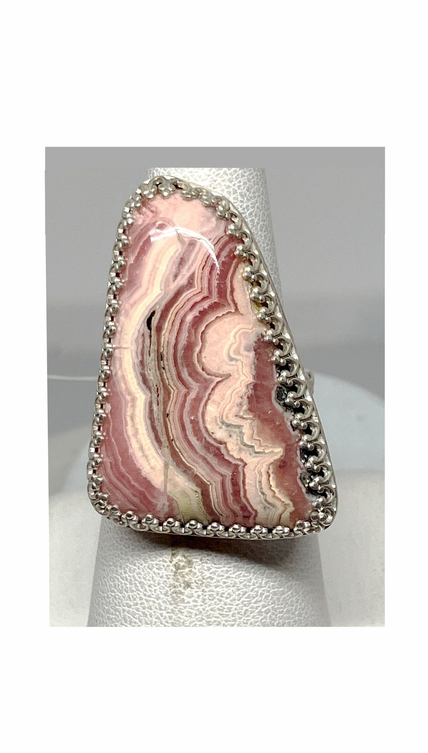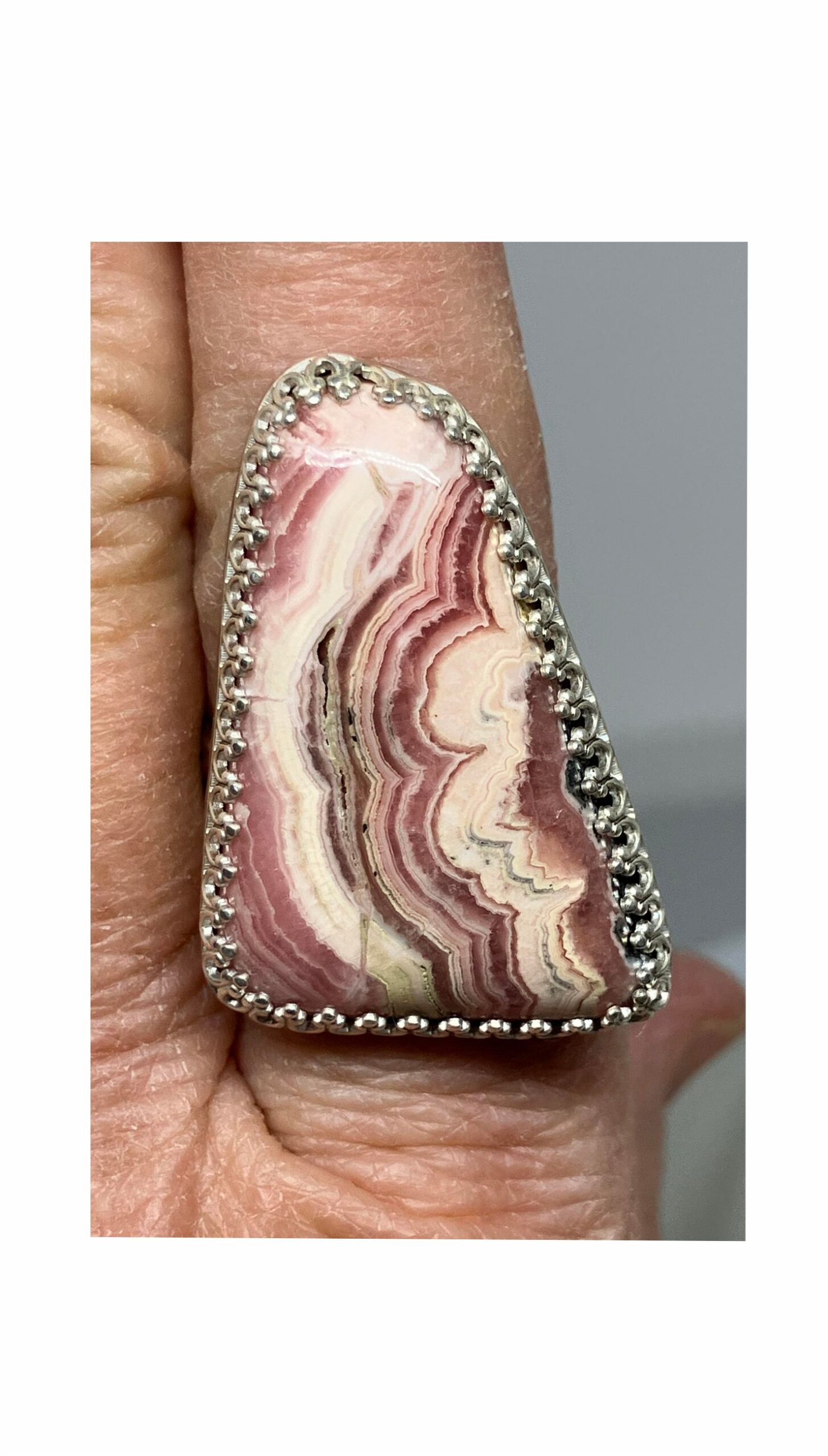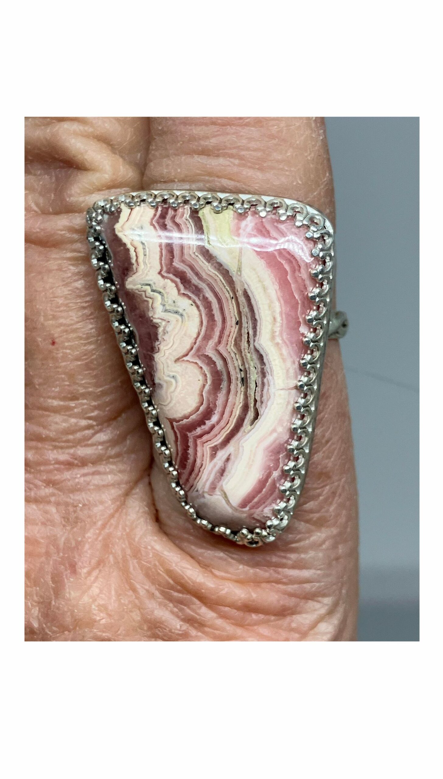 Beautiful pink and white striped ring is Rhodochrosite. Unique stone from Argentina. Sterling Silver Bezel and band. Fine Silver back. Approximately 1-1/4″ x 1″. About size 8-3/4 ring. Cut and polished in Reno, Nevada USA. State Stone of Colorado.