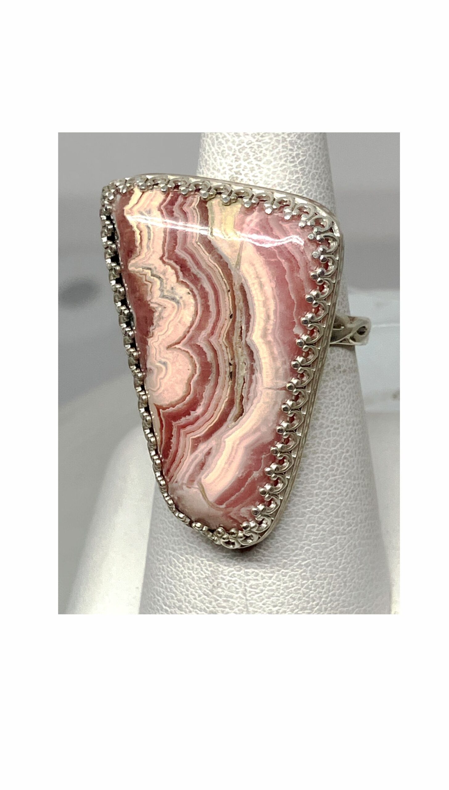 This beautiful pink and white striped ring is called Rhodochrosite. This unique stone came from Argentina. It is a favorite stone of so many because each one is so different from all the others with the personality it shows. It has Sterling Silver Bezel and band. The back is Fine Silver. It is approximately 1-1/4″ x 1″. It is about size 8-3/4 ring size. It was cut and polished in Reno, Nevada USA. Rhodochrosite is the State Stone of Colorado.