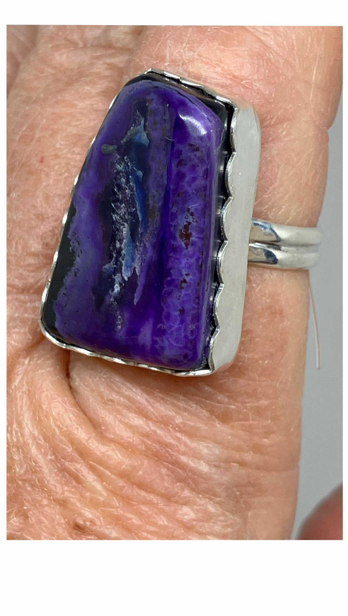 Tags: Africian Sugilite, Handcrafted in Reno NV USA, Made in USA, One of a Kind, Purple Ring, Purple Sugilite, Purple Sugilite Ring, Purple Turquoise, Rare Gemstone, Rare Sugilite Stone, Sterling Silver