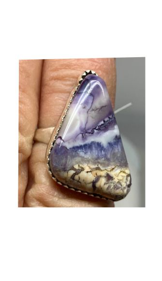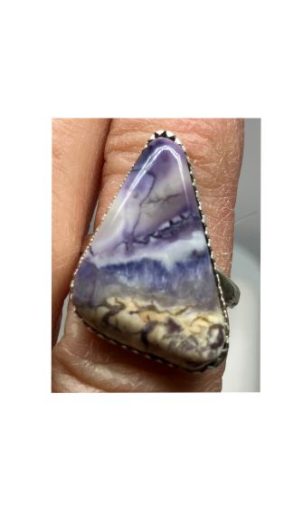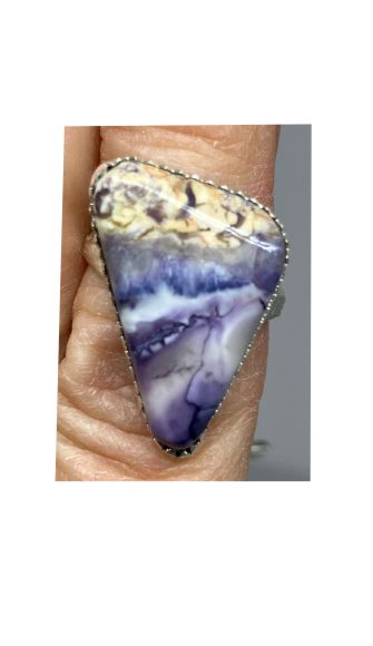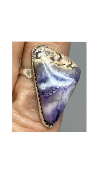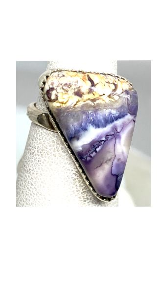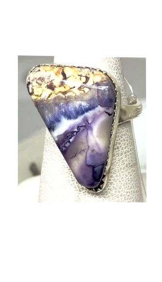 This beautiful purple and white ring was created from a stone called Tiffany, also known as Fossilized Opalite. The stone was mined in Utah USA. It has Fine Silver on sides and back. The ring band is Sterling Silver. It was cut, polished and completed in Reno NV USA. The ring is about size 6-1/4.