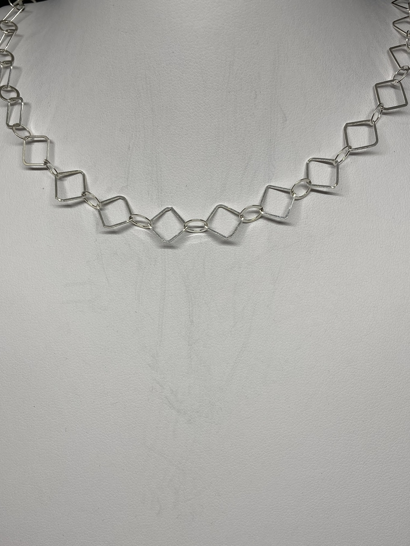 This beautiful Sterling Silver Necklace is a diamond and circle open chain loop with the silver loops attached to each other. This is a popular style of necklace and is perfect to be worn with a pendant or by itself or even in a group to make a special ensemble.