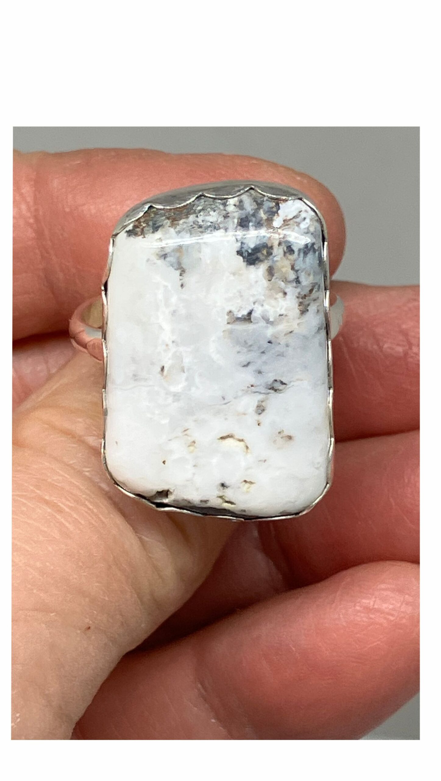White Buffalo Ring with black from Tonopah, Nevada USA. Cut, polished and completed by hand in Reno NV. Fine Silver bezel and back. Sterling Silver band. Approximately 1″ x 3/4″. Ring size about 10-1/2.